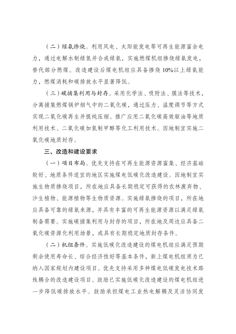 其中指出:利用風(fēng)電、太陽(yáng)能發(fā)電等可再生能源富余電力,通過(guò)電解水制綠氫并合成綠氨,實(shí)施燃煤機(jī)組摻燒綠氨發(fā)電,替代部分燃煤。改造建設(shè)后煤電機(jī)組應(yīng)具備摻燒10%以上綠氨能力,燃煤消耗和碳排放水平顯著降低。二、改造和建設(shè)方式(二)綠氨摻燒。利用風(fēng)電、太陽(yáng)能發(fā)電等可再生能源富余電力,通過(guò)電解水制綠氫并合成綠氨,實(shí)施燃煤機(jī)組摻燒綠氨發(fā)電,替代部分燃煤。改造建設(shè)后煤電機(jī)組應(yīng)具備摻燒10%以上綠氨能力,燃煤消耗和碳排放水平顯著降低。(三)碳捕集利用與封存。采用化學(xué)法、吸附法、膜法等技術(shù),分離捕集燃煤鍋爐煙氣中的二氧化碳,通過(guò)壓力、溫度調(diào)節(jié)等方式實(shí)現(xiàn)二氧化碳再生并提純壓縮。推廣應(yīng)用二氧化碳高效驅(qū)油等地質(zhì)利用技術(shù)、二氧化碳加氫制甲醇等化工利用技術(shù)。因地制宜實(shí)施二氧化碳地質(zhì)封存。三、改造和建設(shè)要求(一)項(xiàng)目布局實(shí)施綠氨摻燒的項(xiàng)目,所在地應(yīng)具備可靠的綠氨來(lái)源,并具有豐富的可再生能源資源以滿足綠氨制備需要。實(shí)施碳捕集利用與封存的項(xiàng)目,所在地及周邊應(yīng)具備二氧化碳資源化利用場(chǎng)景,或具有長(zhǎng)期穩(wěn)定地質(zhì)封存條件。(二)機(jī)組條件。鼓勵(lì)承擔(dān)煤電工業(yè)熱電解耦及靈活協(xié)同發(fā)電、煤電安全高效深度調(diào)峰等技術(shù)攻關(guān)任務(wù)的機(jī)組實(shí)施低碳化改造。鼓勵(lì)煤炭與煤電聯(lián)營(yíng)、煤電與可再生能源聯(lián)營(yíng)“兩個(gè)聯(lián)營(yíng)”和沙漠、戈壁、荒漠地區(qū)大型風(fēng)電光伏基地配套煤電項(xiàng)目率先實(shí)施綠氨摻燒示范。煤電低碳化改造建設(shè)項(xiàng)目應(yīng)嚴(yán)格執(zhí)行環(huán)境管理制度,確保各類污染物達(dá)標(biāo)排放。綠氨摻燒項(xiàng)目氨存儲(chǔ)設(shè)施原則上應(yīng)建于煤電機(jī)組廠區(qū)外,項(xiàng)目實(shí)施單位應(yīng)進(jìn)一步明確并嚴(yán)格執(zhí)行具體管理要求。四、保障措施(三)優(yōu)化電網(wǎng)運(yùn)行調(diào)度。研究制定煤電低碳化改造建設(shè)項(xiàng)目碳減排量核算方法。推動(dòng)對(duì)摻燒生物質(zhì)/綠氨發(fā)電、加裝碳捕集利用與封存設(shè)施部分電量予以單獨(dú)計(jì)量。(四)加強(qiáng)技術(shù)創(chuàng)新應(yīng)用。加強(qiáng)煤電摻燒生物質(zhì)、低成本綠氨制備、高比例摻燒農(nóng)作物秸稈等技術(shù)攻關(guān)。原文如下:(來(lái)源: 氫能觀察)請(qǐng)點(diǎn)擊查看通知原文
